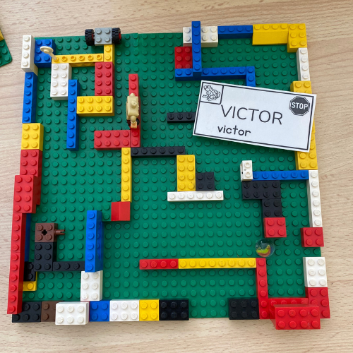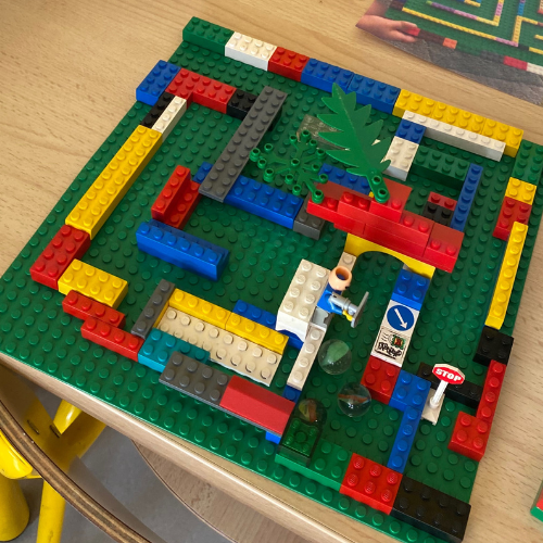 Voorzie één of twee voorbeeldfoto's ter inspiratie en bespreek kort wat een doolhof is. Daarna mogen de kleuters zelf aan de slag gaan en hun eigen doolhof ontwerpen. Sommige kleuters bouwen vrij, terwijl anderen heel doelgericht werken en extra elementen toevoegen zoals een poortje, een tunnel of smalle doorgangen.