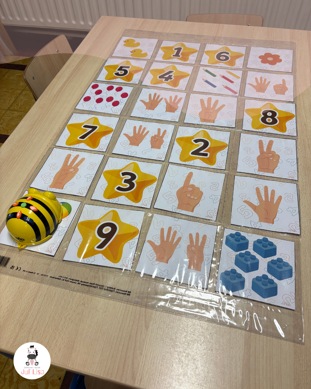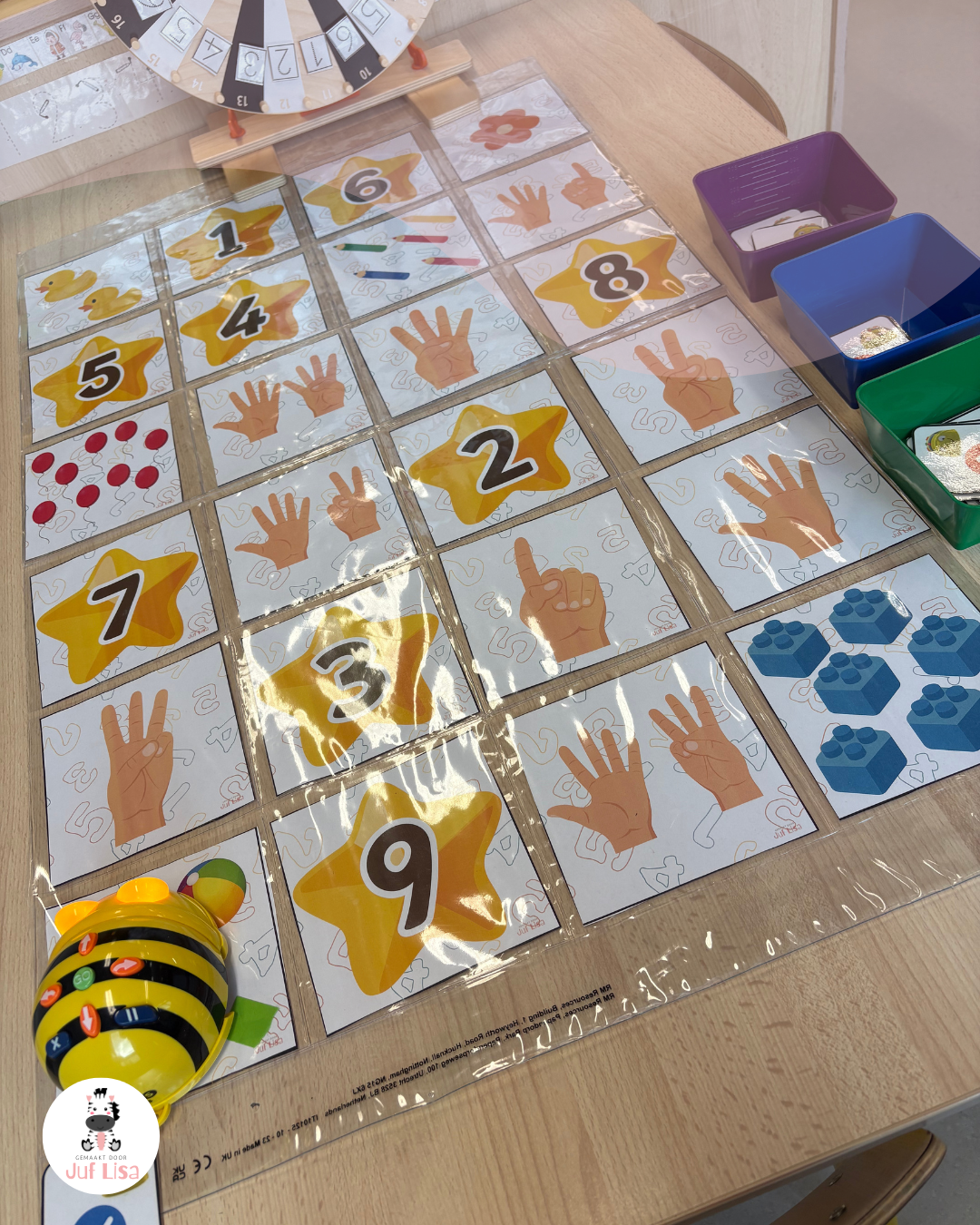 - Neem een zakje met cijfers in, laat de kleuters een cijfer grabbelen en naar een vakje op de mat rijden met evenveel op (je kan ook 'meer' of 'minder' gebruiken)