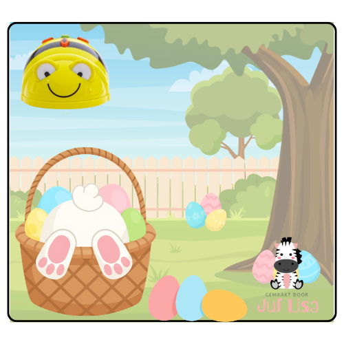 De kleuters programmeren de Bee-Bot om paaseieren te verzamelen en naar de juiste paashaas te brengen. Met behulp van opdrachtenkaarten sturen ze de Bee-Bot eerst naar het juiste eitje en daarna naar de juiste bestemming.